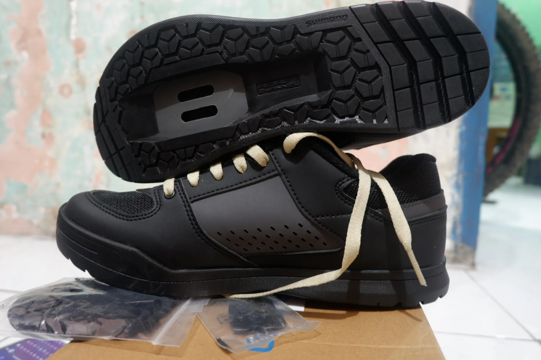 Terdapat 2 buah tali sepatu, warna hitam dan krem. Ada juga SM-SH51 cleats (single release) dan sticker buat nutupin bawah cleat.